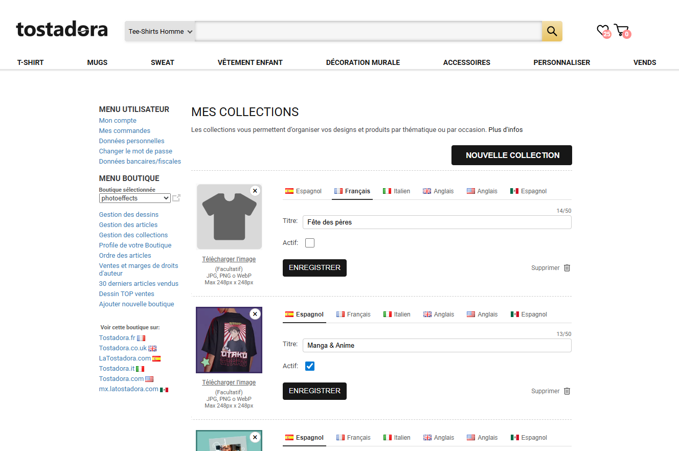 Les collections sont des regroupements thématiques de designs et de produits au sein de votre boutique. Elles vous permettent d’organiser votre catalogue par thèmes, styles ou occasions (par exemple : « Fête des pères », « Manga & Anime », « Animaux »), afin de faciliter une recherche rapide et visuelle pour vos clients.